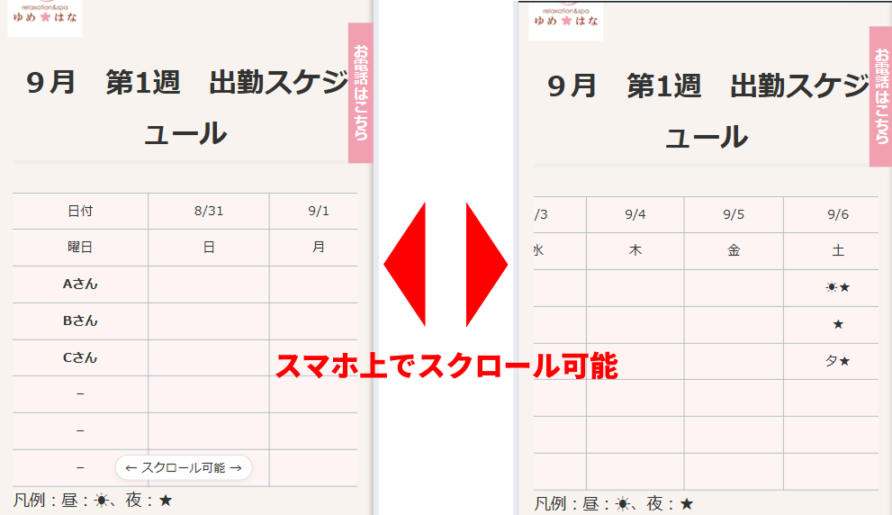 このスケジュールの表はスマホ画面では横スクロールするように組んでいますが、